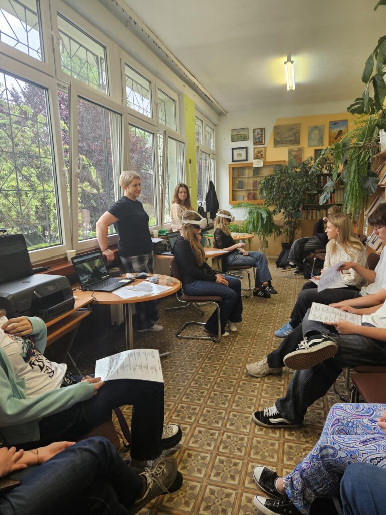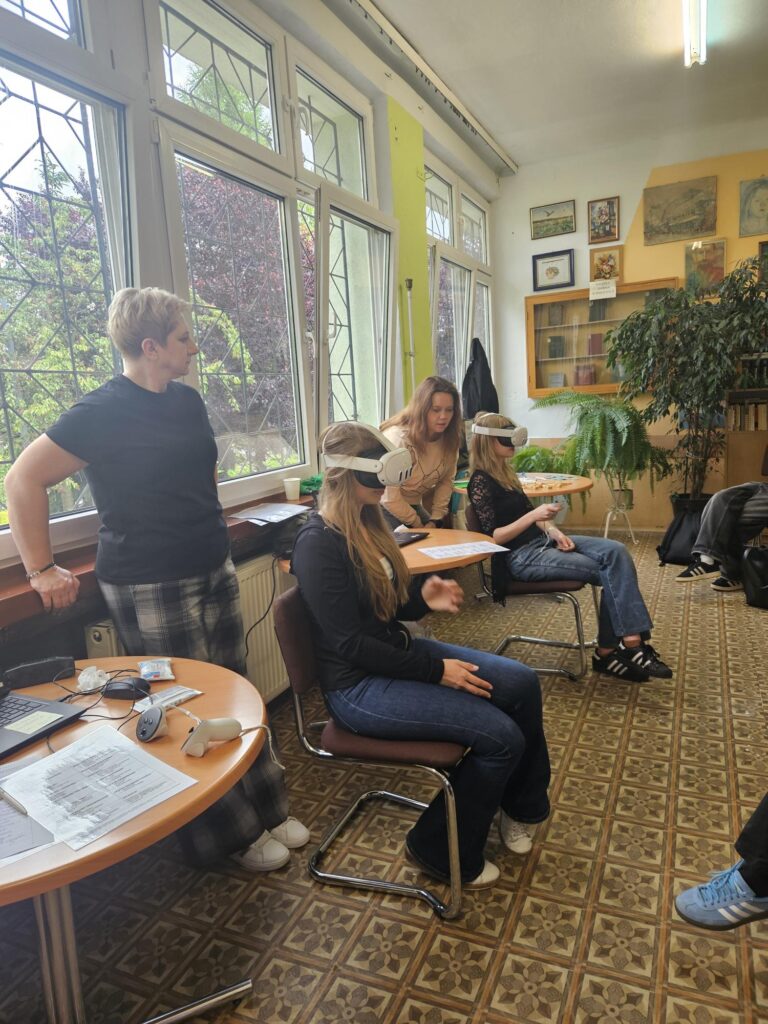 Dnia 11 czerwca gościliśmy doradców zawodowych z PUP w Dąbrowie Górniczej. Uczniowie uczestniczący w zajęciach Google VR mają możliwość „wejście w rolę” różnych specjalistów, np. strażaka, inżyniera, mechanika. Warsztaty z wykorzystaniem VR pomagają w świadomym wyborze przyszłego zawodu. Pozwala na zobaczenie, jak wygląda praca w konkretnym zawodzie i na wizualizację przyszłości zawodowej. Umożliwia bardziej angażujące i interaktywne doświadczenia edukacyjne i zawodowe. Indywidualny wybór ścieżki edukacyjnej i zawodowej dzięki okularom VR pozwalają na szybkie i efektywne zdobywanie wiedzy o zawodach.