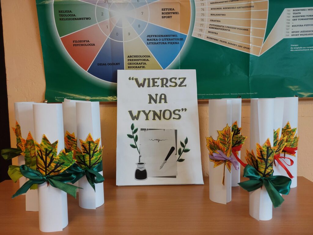 Akcja „Wiersz na wynos” w bibliotece szkolnej„Wiersz na wynos” to inicjatywa promująca poezję, zachęcająca do czytania, pisania i dzielenia się poezją. Ideą jest oferowanie wierszy do wzięcia w miejscach publicznych, zatem zajrzyj do biblioteki i zabierz wiersz ze sobą, a sprawi on, że to będzie wyjątkowy dzień!Celem akcji jest wartościowe urozmaicenie codziennych doświadczeń, np. poprzez umilenie czasu wolnego, a także dzielenie się wrażliwością i budowanie więzi międzyludzkich poprzez sztukę. Akcja ma charakter cykliczny, wpisuje się w działania biblioteki promujące czytelnictwo.