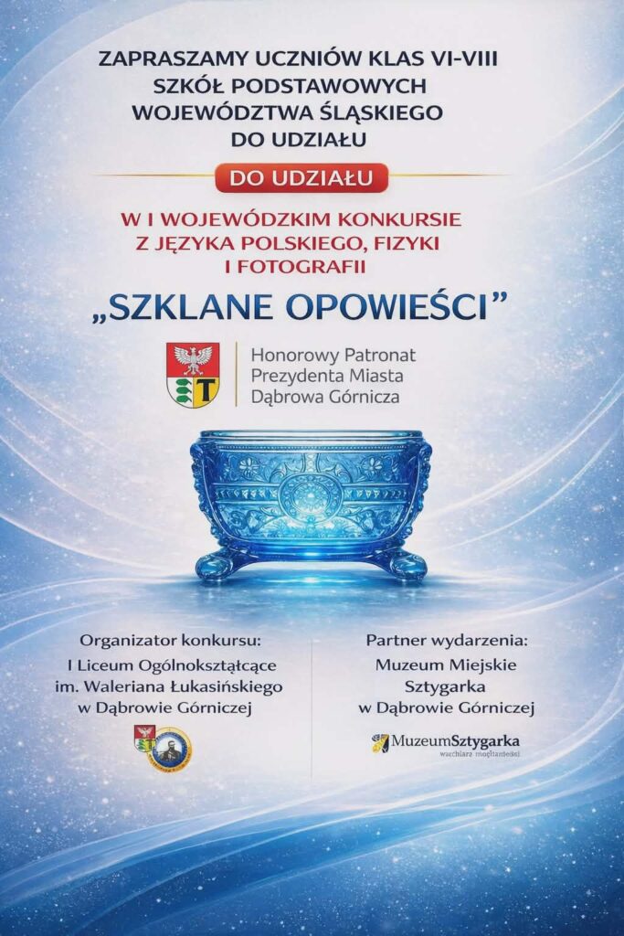 Zapraszamy uczniów klas VI – VIII szkół podstawowych z województwa śląskiego do udziału w I WOJEWÓDZKIM KONKURSIE Z JĘZYKA POLSKIEGO, FIZYKI I FOTOGRAFII „SZKLANE OPOWIEŚCI” pod HONOROWYM PATRONATEM PREZYDENTA MIASTA DĄBROWA GÓRNICZA.